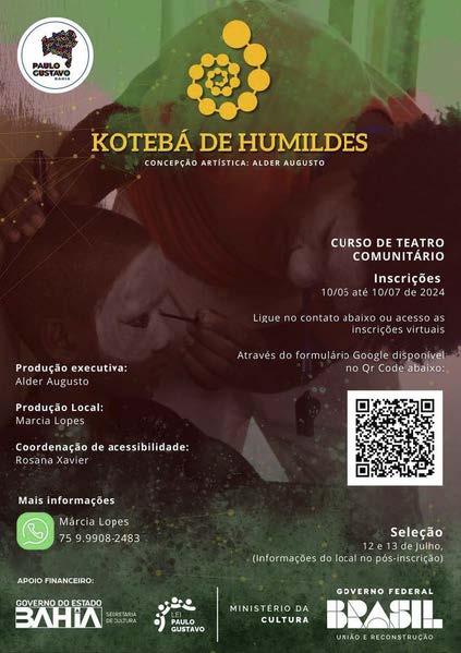 O Kotebá de Humildes é uma potente iniciativa cultural que integra formação artística, valorização da memória comunitária e protagonismo local no distrito de Humildes, em Feira de Santana (BA). Inspirado no teatro tradicional africano do povo bambara, o Kotebá é adaptado para a realidade brasileira como ferramenta de criação coletiva, crítica social e celebração da ancestralidade negra. A proposta visa a formação continuada de jovens e moradores da comunidade em teatro comunitário, com ênfase em processos colaborativos de criação, técnicas de encenação e interpretação, construção de figurinos, dramaturgia popular e produção cultural de base.